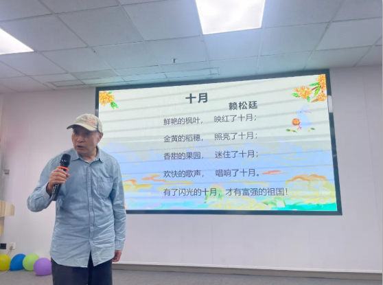 令人惊喜的是,中国知名儿童文学家、原绵阳市作家协会主席赖松廷先生亲临活动,为大家带来了文化盛宴。他特意为双节创作了两首诗《十月》和《三个月亮》,并在现场声情并茂地朗诵。悠扬的语调和真挚的情感赢得了热烈掌声,阿姨们表示,聆听知名作家的朗诵丰富了文化生活,感受到了节日的独特韵味。